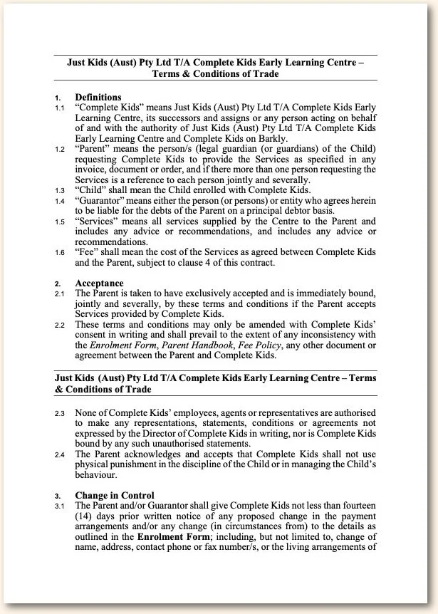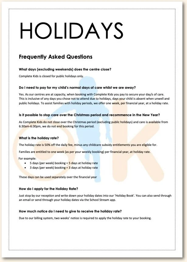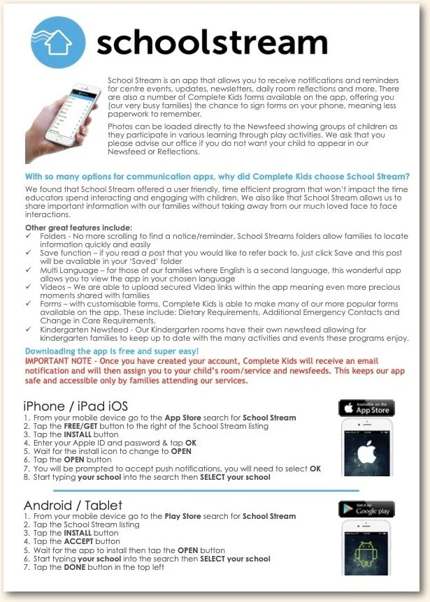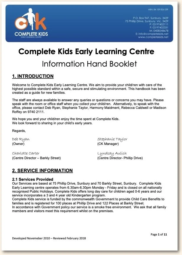 Policies and Procedures School Stream Communication App Holidays Complete Kids T&Cs CK Long Day Care Handbook – Reviewed June 2022